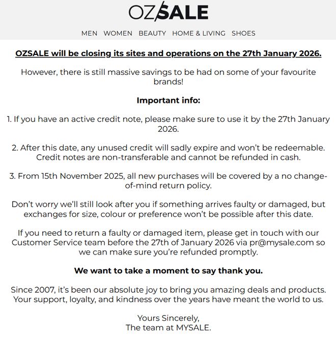 继聚美丽上月报道韩国昔日主流电商平台薇美铺(WeMakePrice)负债20亿,宣告破产后,又一知名电商平台即将全面停止运营。 聚美丽获悉,有着“海外版唯品会”之称的澳大利亚知名电商平台Ozsale于近日确认,将自2026年1...